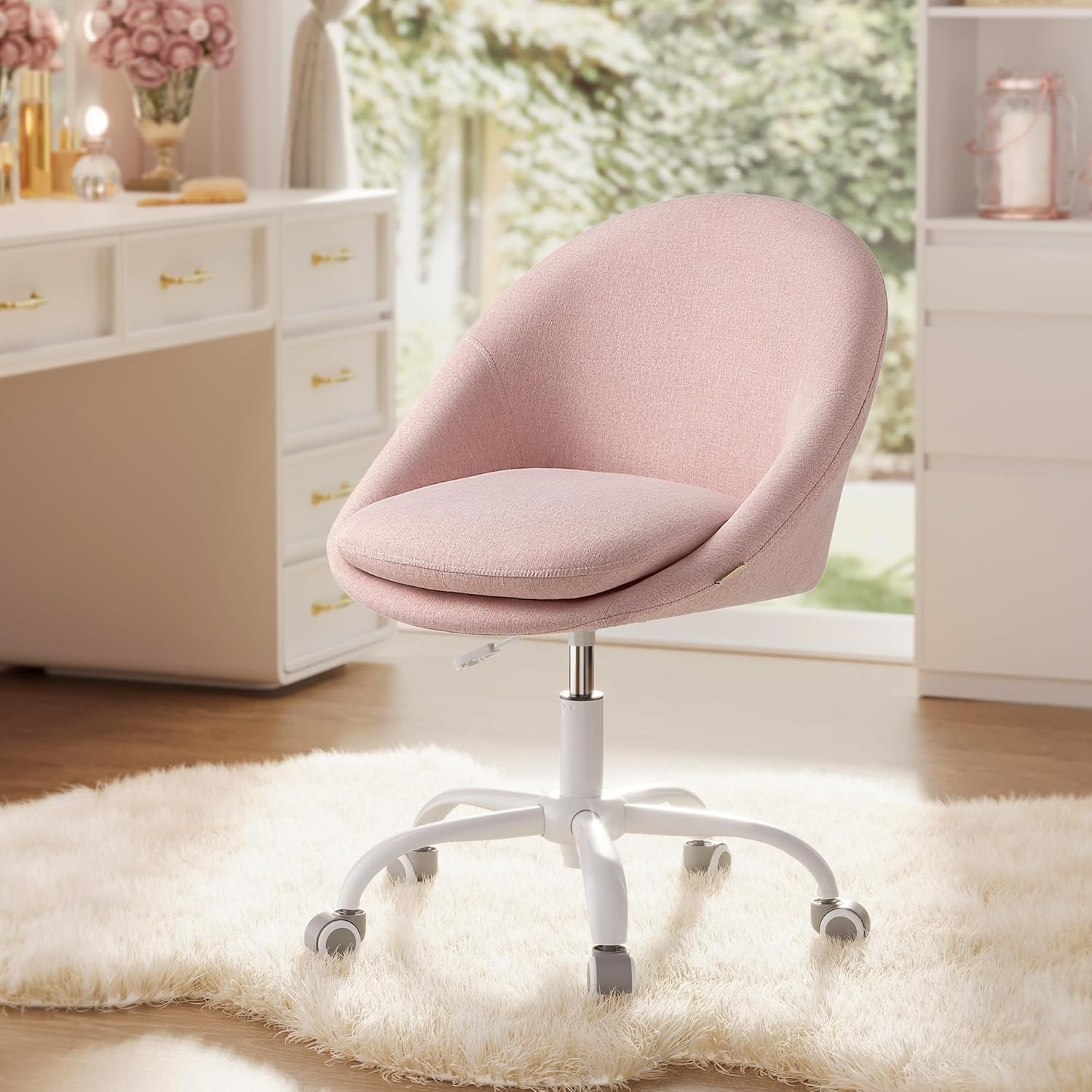 “Not only soft to the touch, but it’s cute and creates a less-serious feel in your working space. Home office chair is great for bedrooms..”